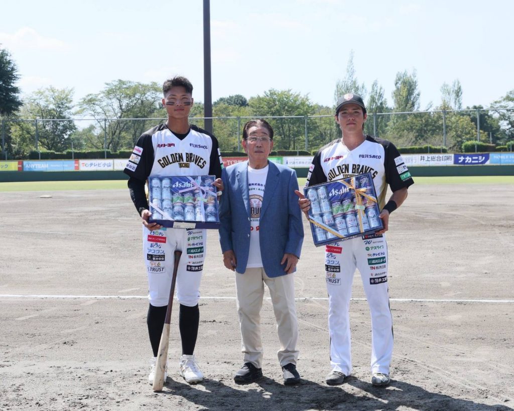 5鈴木智也選手と8三方陽登選手に代表荒金よりプレゼント贈呈がありました。